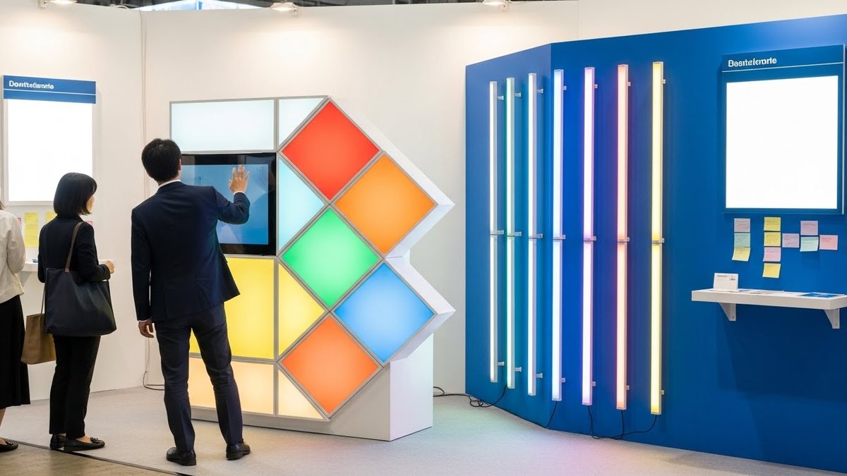 会場では遠距離からの視認性が重要です。大きな色面、はっきりしたロゴ、動く要素(ライトやディスプレイの切り替え)を使い、目線を引きつけます。文字は短く、一目で分かる言葉を選んでください。